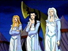 Nearby, these events were viewed by the Archmage and his future self, the latter having come into existence through the paradoxical use of the Phoenix Gate. The Uber-Archmage reverted the sisters from owls and back into their humanoid forms. And then he offered them a chance for an alliance with him in order to avenge themselves. Because they failed in their duty to guard the gates of Avalon and knew that Oberon would banish them from there for it they were happy to comply with his request to team up. He informed them that it would take approximately 1000 years to get their revenge to which they replied, "What is time to an immortal?" He then tells them that he'd see them again in 25 years. Then they all reappeared as Demona was raiding the storehouse in 1020 AD; and, again at Castle Moray as Findlaech was training Macbeth. Then he told them to guide the lives of Demona and Macbeth so that they may be able to conquer Avalon. The sisters reminded him of Oberon's law prohibiting them from directly interfering in mortal affairs; and, the Uber-Archmage points out that "surely the law that cannot be broken...can be bent." And, by having an indirect part in their pawns' lives, they would not be breaking the law. He then asks that they watch out for the Grimorum Arcanorum, the Eye of Odin, and the Phoenix Gate and meet back at the barge in 975 years, which perplexed the sisters, who said, "... but you already have the eye and the gate." Then he states that he didn't acquire those items until they gave them to him and then both Archmages and the triplets vanish.